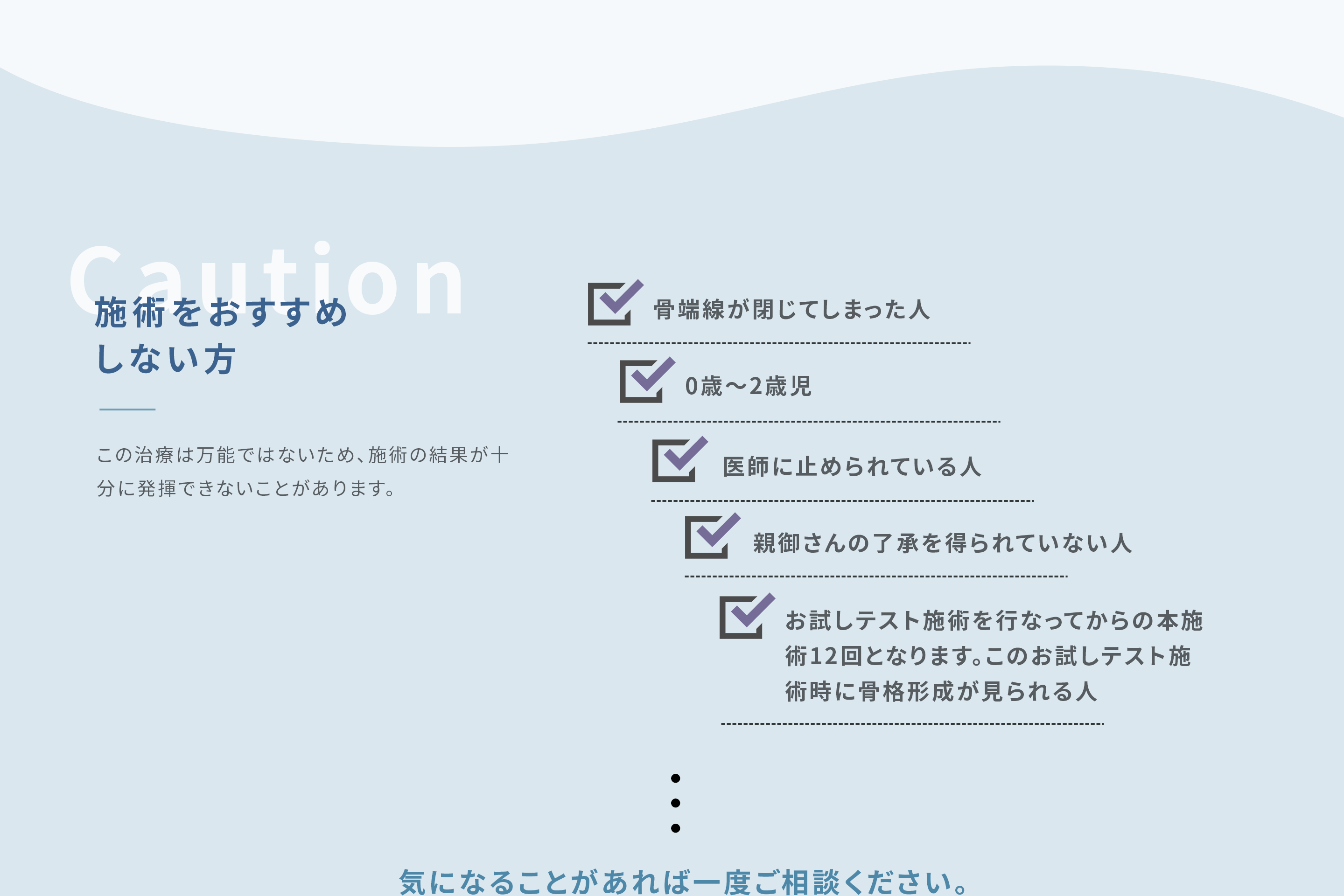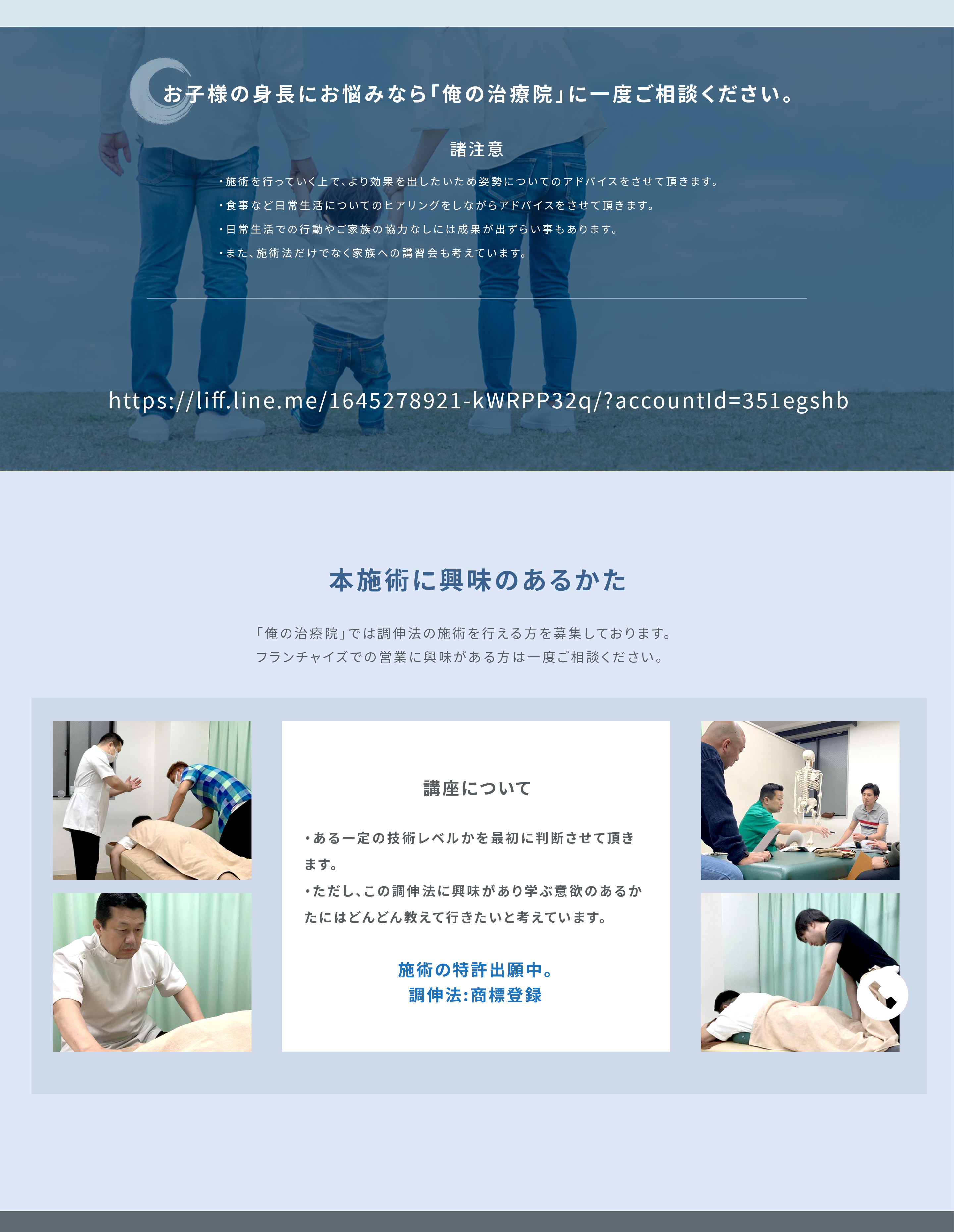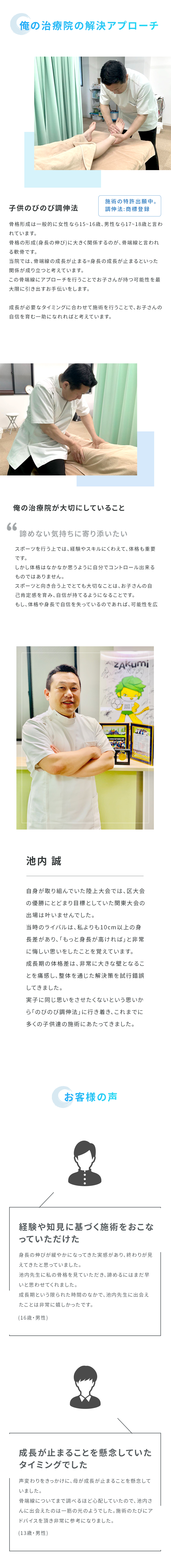 • 【子供のびのび調伸法】骨格形成は一般的に女性なら15~16歳、男性なら17~18歳と言われています。骨格の形成(身長の伸び)に大きく関係するのが、骨端線と言われる軟骨です。当院では骨端線の成長が止まる=身長の成長が止まるといった関係が成り立つと考えています。この骨端線にアプローチを行うことでお子さんの持つ可能性を最大限に引き出すお手伝いをします。成長が必要なタイミングに合わせて施術を行うことで、お子さんの自信を育む一助になれればと考えています。 【池内誠】自身が取り組んでいた陸上大会では、区大会の優勝にとどまり目標としていた関東大会の出場は叶いませんでした。当時のライバルは、私よりも10cm以上の伸長差があり、「もっと身長が高ければ」と非常に悔しい思いをしたことを覚えています。成長期に対格差は、非常に大きな壁となることを痛感し、“整体”を通じた解決策を試行錯誤してきました。実施に同じ思いをさせたくないという思いから「のびのび調伸法」に行き着き、これまでに多くの子供達の施術にあたってきました。