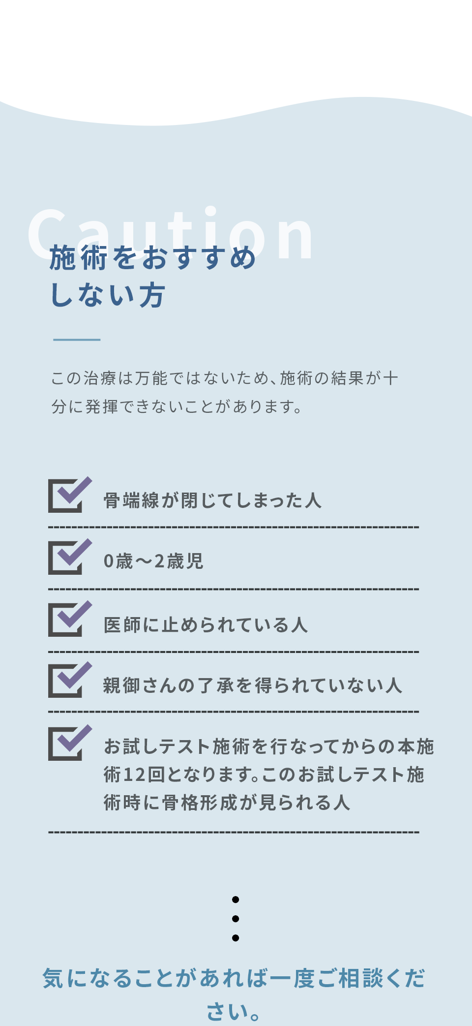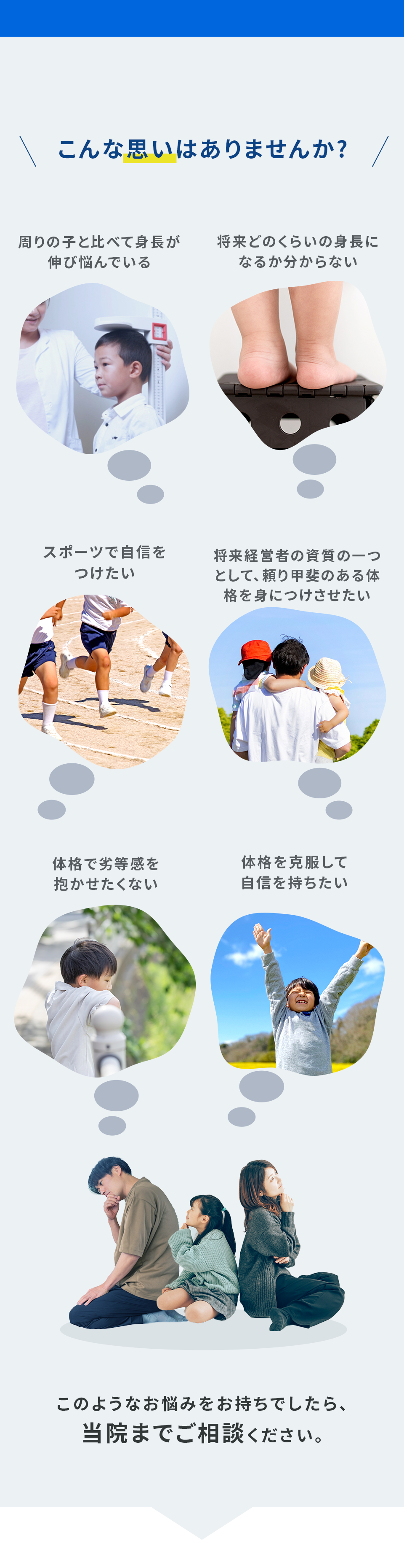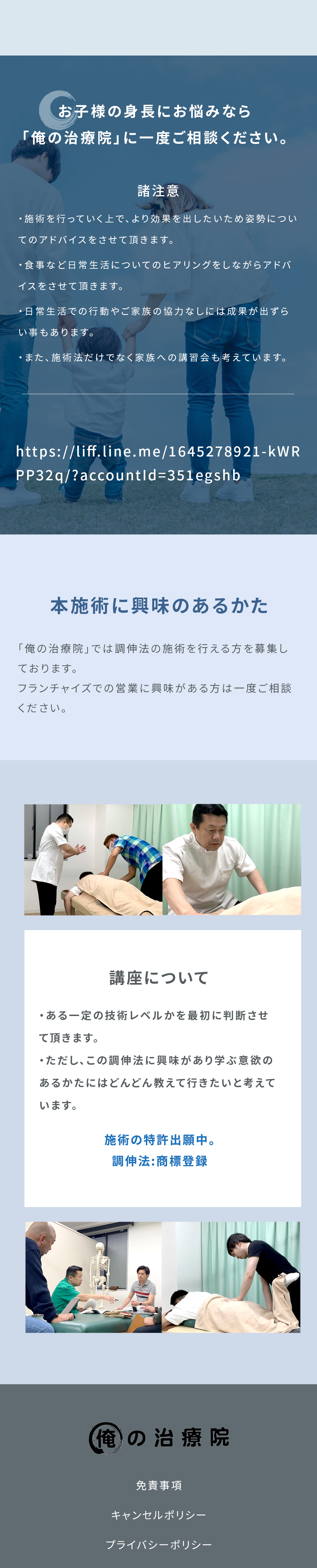 • 【子供のびのび調伸法】骨格形成は一般的に女性なら15~16歳、男性なら17~18歳と言われています。骨格の形成(身長の伸び)に大きく関係するのが、骨端線と言われる軟骨です。当院では骨端線の成長が止まる=身長の成長が止まるといった関係が成り立つと考えています。この骨端線にアプローチを行うことでお子さんの持つ可能性を最大限に引き出すお手伝いをします。成長が必要なタイミングに合わせて施術を行うことで、お子さんの自信を育む一助になれればと考えています。 【池内誠】自身が取り組んでいた陸上大会では、区大会の優勝にとどまり目標としていた関東大会の出場は叶いませんでした。当時のライバルは、私よりも10cm以上の伸長差があり、「もっと身長が高ければ」と非常に悔しい思いをしたことを覚えています。成長期に対格差は、非常に大きな壁となることを痛感し、“整体”を通じた解決策を試行錯誤してきました。実施に同じ思いをさせたくないという思いから「のびのび調伸法」に行き着き、これまでに多くの子供達の施術にあたってきました。